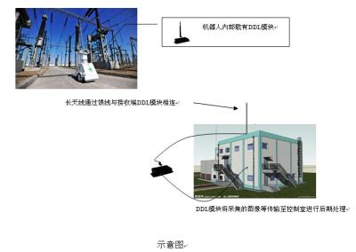 巡检机器人将采集的图像、数据等信息通过其内部载有的DDL模块以无限的方式发送出去,在变电站某制高点处有一长天线,其一段连接另外一只DDL,这样就可以将机器人发送过来的信息接收并且透明地传输给控制室以便接收到实时的数据和图像信息并作后期处理。